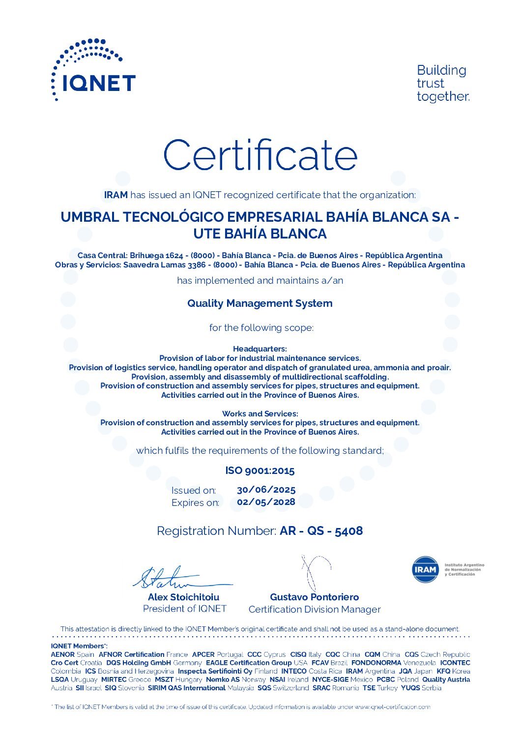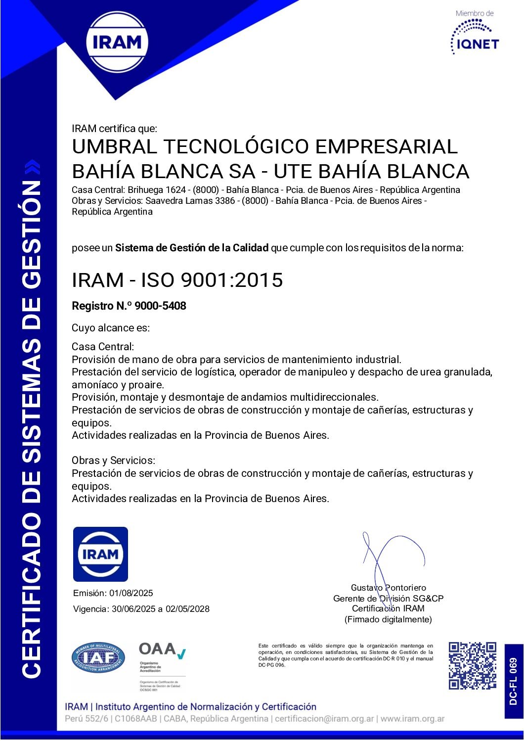 Umbral Tecnológico Empresarial S.A. se encuentra en la actualidad con Certificación de la Norma ISO 9001:2015 ( Control de Calidad )